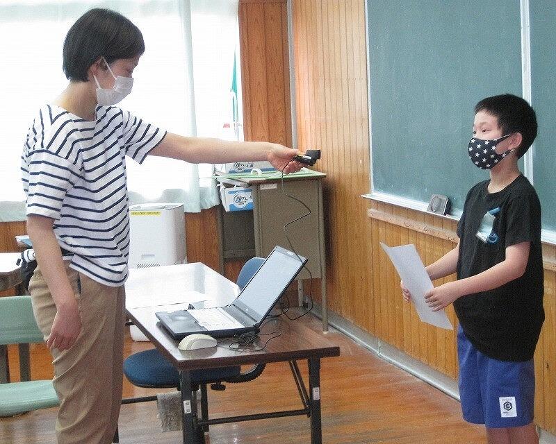 本年度から体力テストで計測した結果を記録用紙に記入するのではなく、児童自らタブレットにて入力できるようになりました。5年生がQRコードを読み込んでその準備をしていました。その後、体力テストの種目ごとの動画を視聴して正しいやり方を学んでいました。