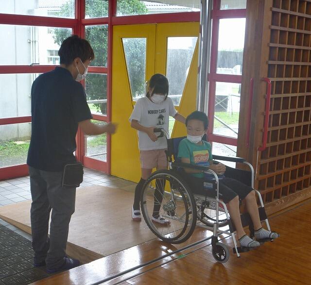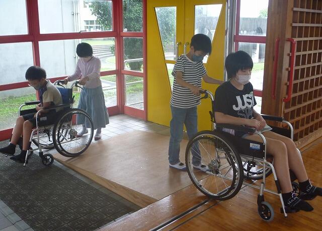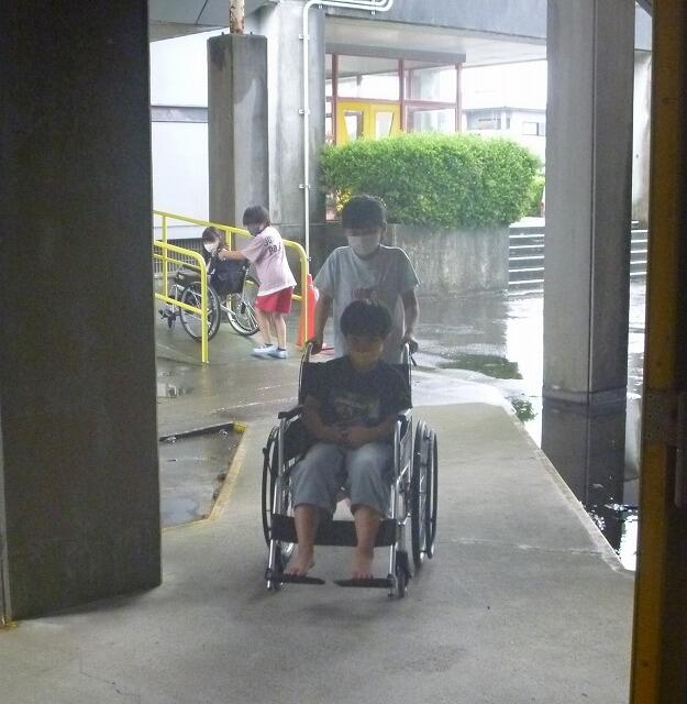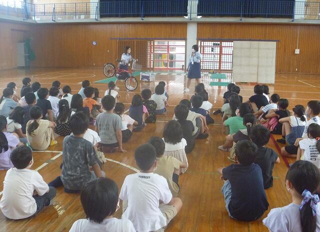 7月4日(月)、社会福祉協議会から3名が来校されて、4年生を対象に車いす体験学習がありました。説明を受けた後、交代で車いすに乗る体験や押す体験をしました。乗っている人の安全を考えてポイントごとに声をかけることや、ゆっくり進むことなどに気をつけて活動しました。
