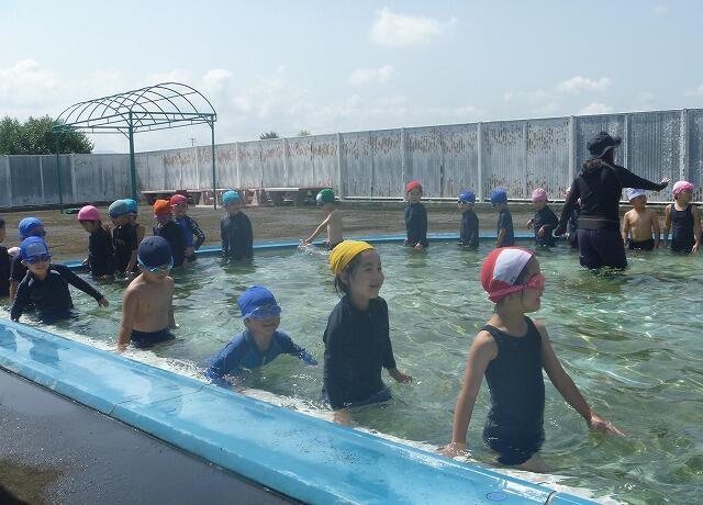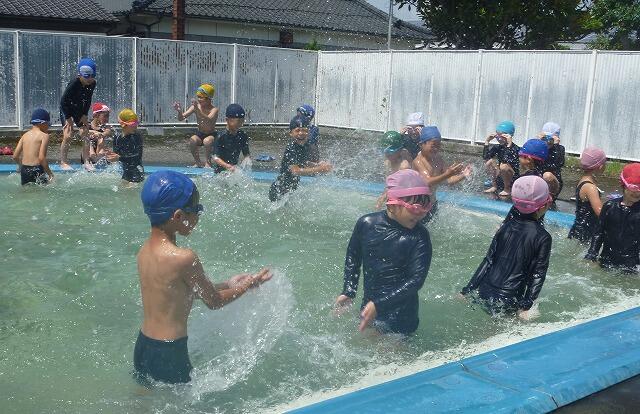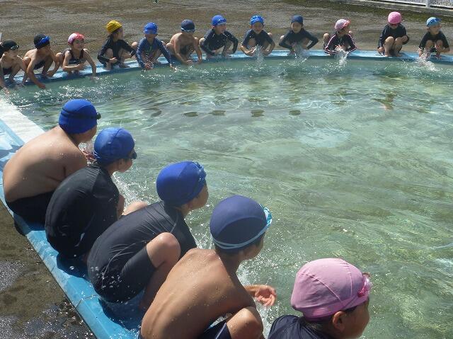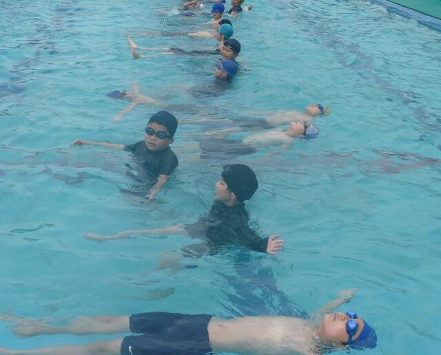 7月12日(火)、4年生がプール開きをしました。「プール使用の約束」を確認した後、シャワーで体を洗って入水しました。子どもたちは久しぶりのプールにとてもうれしそうでした。水に慣れるために、ふし浮きやけ伸びなどに取り組んでいました。