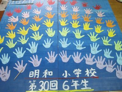 3月8日(火)、6年生がパネルづくりをしています。このパネルは、五十市地区まちづくり協議会主催の「イルミ&アートフェスタ」で飾られる予定です。6年生が、2枚のパネルに自分の手型と卒業にあたっての思いを表現しています。