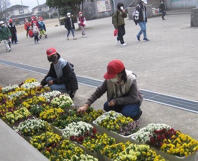 卒業式の会場に飾るパンジーやビオラがきれいに咲き揃いました。5年生や教頭先生が、毎日お世話を続けてきたからでしょう。24日の卒業式まであと数日となりました。