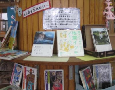 3月の学校図書館を紹介します。本をかりると桜の花びらが増えていきます。たくさんの花が開きました。本の紹介コーナーは、震災に関連した本でした。ほとんどの子供が年間の読書目標冊数を達成するほど本が大好きな明和っ子です。