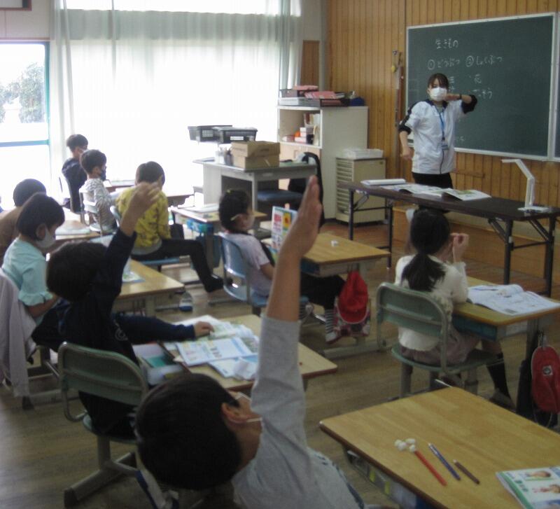 5月6日(金)、3年生が外国語の学習をしていました。3年生以上は、ALTのエバ先生と外国語専科の先生の2人に教えてもらいます。今日は、あいさつや自己紹介をゲーム形式で練習していました。いつも楽しそうな英語の声が聞こえてきます。