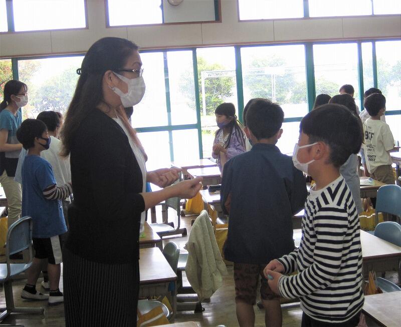 5月6日(金)、3年生が外国語の学習をしていました。3年生以上は、ALTのエバ先生と外国語専科の先生の2人に教えてもらいます。今日は、あいさつや自己紹介をゲーム形式で練習していました。いつも楽しそうな英語の声が聞こえてきます。