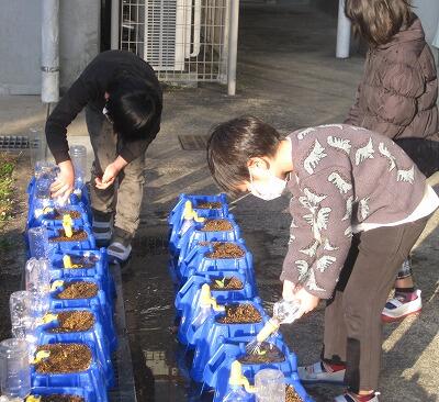 2月18日(金)、1年生が毎朝、一生懸命に水やりをしています。前に植えたチューリップの球根です。お休みしているお友達の分まで水をあげていました。お世話の甲斐あって、やっと小さな芽が出てきました。「ぼくのも早く出てこないかな」とつぶやきながら水をあげています。