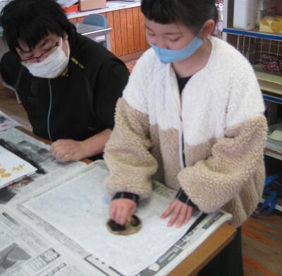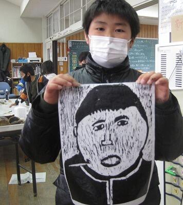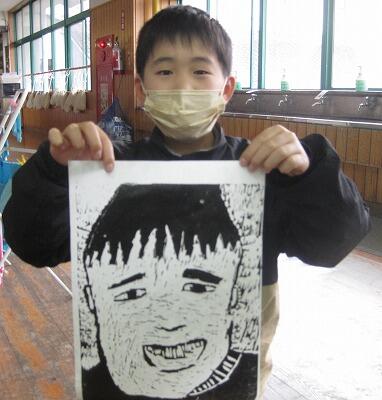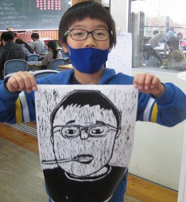 2月2日(水)、先週紹介した4年生の木版画が仕上げの段階に入りました。インクをローラーで版木につけて、バレンで円を描くように刷っていきます。友達と協力して、インクがつかないように注意しながら作業していました。出来上がった作品は、やっぱり本人にそっくり!!