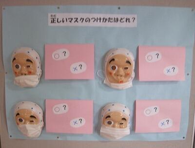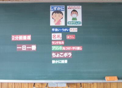 2月7日(月)、コロナウイルス感染防止のため学校では対策を強化しているところです。その中の一つに掲示の工夫があります。教室の黒板には、朝登校してきた子供のためにメッセージや気を付けること等が掲示してあります。廊下には、正しいマスクの付け方について、ひょっとこのお面を使った掲示がしてあります。少しでも明るい気持ちになれるようにという先生達の工夫です。