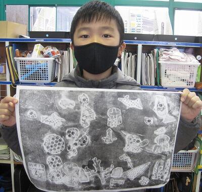 2月15日(火)、3年生の紙版画が最後の段階に入りました。イメージを広げて、思い思いの色をつけたら完成です。それぞれの作品を誇らしげに見せてくれました。