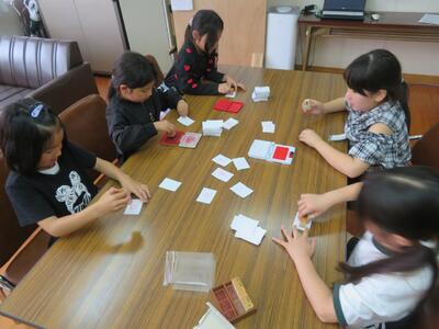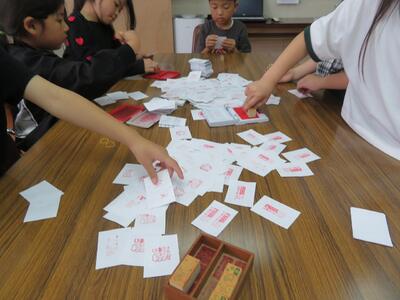 「もらった人がうれしくなるように、丁寧にスタンプを押そうね。」と伝えると、とってもきれいにスタンプを押して作ってくれました。