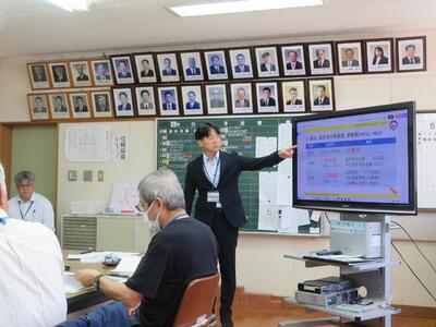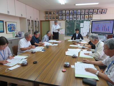 役員選出後、校長から委員の皆さんに、本年度の児童数や学級数、職員の状況に加え、学力や生徒指導など、学校の状況を説明しました。