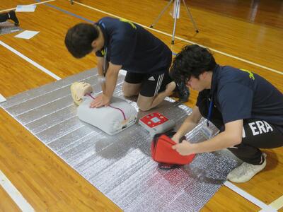 胸骨圧迫をする職員とAEDを準備する職員です。