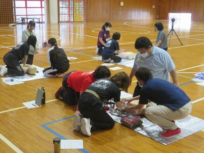 研修用の模型に、心肺蘇生を行います。1分間に100~120回のリズムで押すことや、成人では5センチ胸骨圧迫を行うこと、AEDの使い方を学びました。