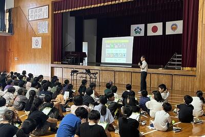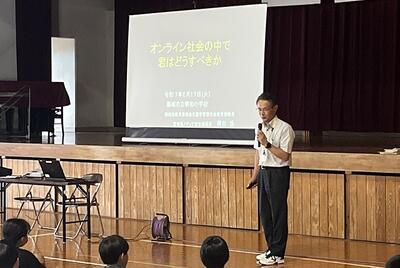 保健委員会の発表の後は、メディア安全指導員の横田先生から、5・6年生児童及び保護者の方に講話をしていただきました。