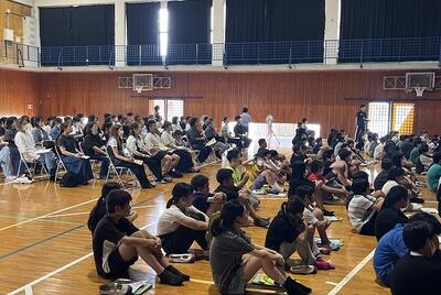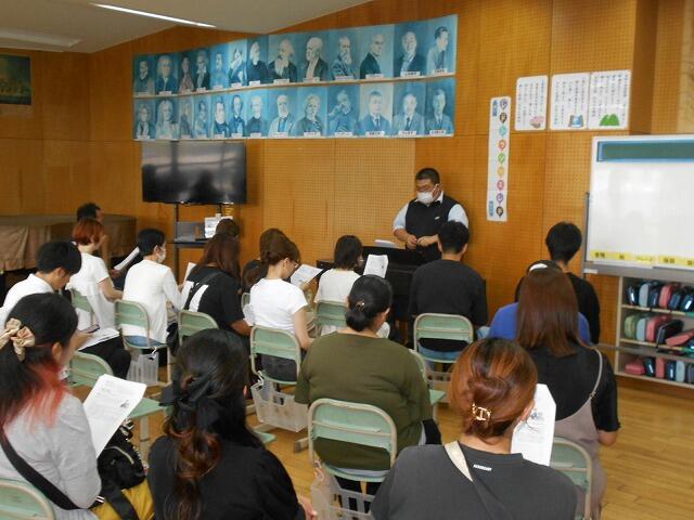ボランティアとして教えてくださる先生方の紹介です。これからお世話になる先生方ですので、真剣に話を聞いています。