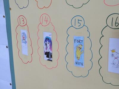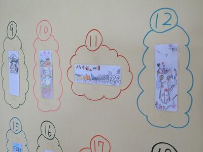 図書室の横に子どもたちが作った、イラスト入りのしおりを掲示しています。