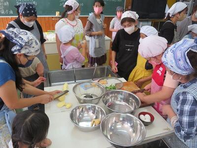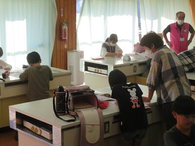 料理教室です。郷土料理「がね」を親子で作ります。包丁で材料を切るのに慣れていない子どもたちに、保護者の方が、優しく教えてくださいました。