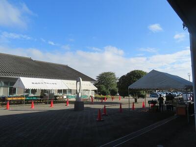 児童玄関前には、マルシェが開かれます。朝、職員とPTA役員の方でテントを立てました。