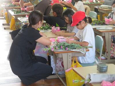 フラワーアレンジメントです。校区内の「フロリスト花もよう」の大峯さんが御指導してくださいました。