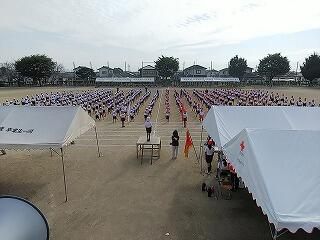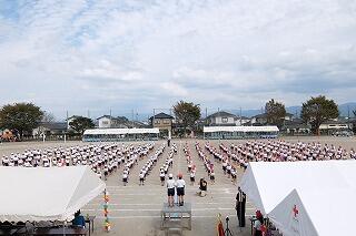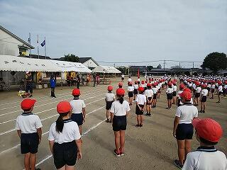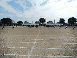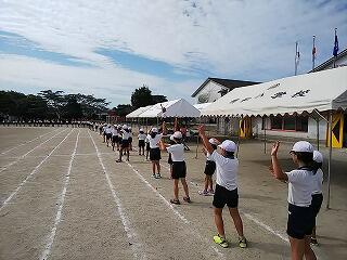 すがすがしい秋空の元、3回目の全校体育を行いました。今回は、2時間連続で行い、開会式や応援、明和音頭、全校リレーの練習と、係の子どもたちの動きの確認などを行いました。