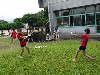 1年生では、生活科の時間に、水遊び・シャボン玉遊びをしました。この日の天気は、曇りでしたが、友達に水をかけたり、大きなシャボン玉を作ったりととても楽しそうな1年生でした。