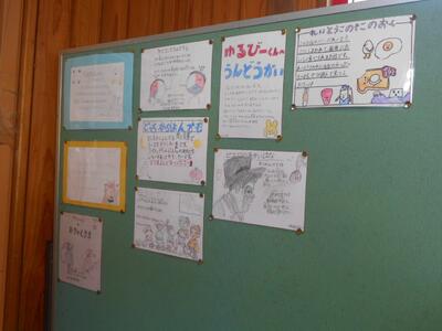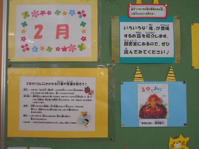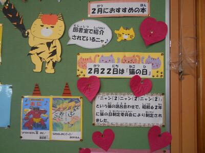 鬼だけではなく、2月22日「猫の日」の紹介もありました。子どもたちの目をひく、かわいらしい掲示です。