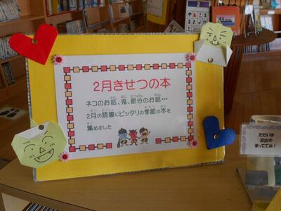 2月も素敵な掲示です。図書室入り口には、「鬼」にまつわる本をたくさん紹介しいます。