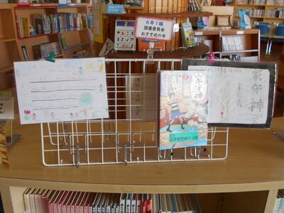 本の紹介文とその横に本を置いています。子どもたちが気になる本をすぐに手に取れるように工夫してくださっています。左の本はすでに借りられているようです。返却を待っている子もたくさんいそうです。