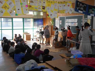 3年生は、総合の時間に取り組んだ、都城弁での劇を披露しました。昔の都城のことを教えてくださった、地域の先生も来られていました。方言も上手です。