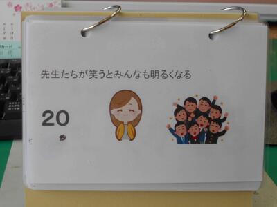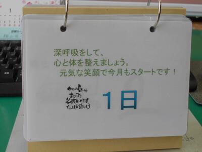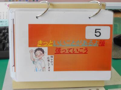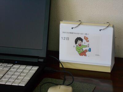そのパソコンの横には、ジブラルタ生命が作成している日めくりカレンダーを置いています。このカレンダーには、先生方を励ます言葉やエピソードが書かれてあり、出勤を記録する際に、先生方の目に入るようにしています。