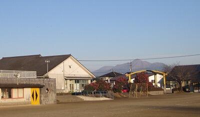 2月16日(水)、運動場から高千穂の峰が見えます。冬の朝は、ひときわ美しく見えます。本校の校歌や校章にも描かれている霧島連山です。