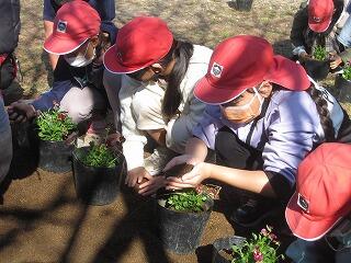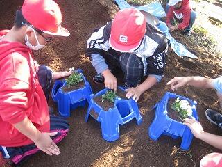 11月15日(月)、2年生と4年生が花の苗植えをしていました。春に咲くビオラやパンジー、ノースポールの花を学級園に植えました。また、卒業式で飾るために一人一鉢でビオラも植えていました。みんなていねいに優しく植えていました。