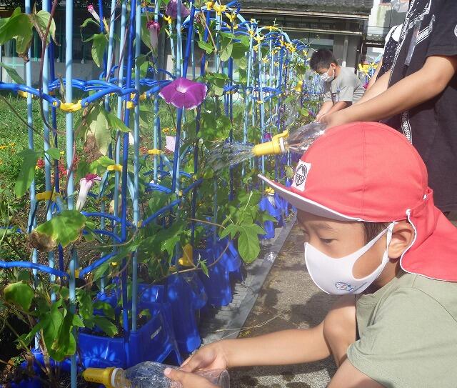 7月に入ってから、1年生が育ててきた朝顔が、色とりどりにきれいな花を咲かせています。これまで水やりのお世話をがんばってきたからでしょう。「この色がいいなあ」「青色が進化してる!」と朝顔を見ながら話している子供たちです。