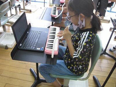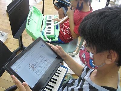 6月23日(水)昼休みに、音楽室で3年生が鍵盤ハーモニカの自主練習をしていました。自主的に取り組んでいたことにも感心しましたが、もっと驚いたのはタブレットを使って練習している姿でした。タブレットの楽譜に注意点を書き込んで、画面を見ながら練習していました。