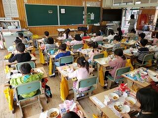 5年生や6年生の給食当番が配膳してくれるのを、静かに座って待つことができる1年生です。