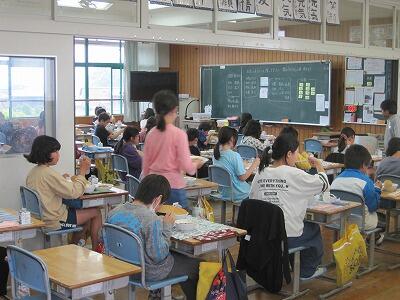 5月21日(金)、6年生が算数の学習をしていました。難しそうな分数のかけ算です。4年生以上の算数の学習では、学級を2つに分けて少人数での指導をしています。みんな一生懸命考えて集中して取り組んでいました。