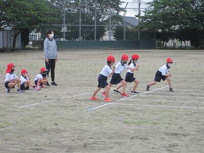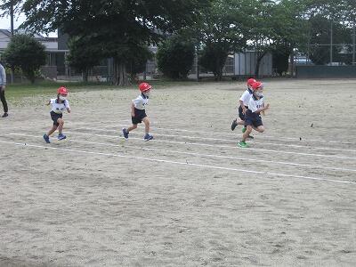 5月14日(金)は、梅雨の合間の曇り空で、1年生が運動場でかけっこをしていました。4,5人ずつ並んで、先生の合図で走ります。スタート位置からやる気満々の様子で、一生懸命に走っていました。