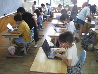 7月15日(木)、雨の日や暑さ指数が高くて外で遊べない日は、タブレットPCでタイピング練習をしている姿を見かけます。5年生の教室を見ると、難しい所などをお互いに教え合いながら、楽しそうにタイピング練習をしています。初級編から徐々にレベルを上げて、上級レベルを達成した子どもも出てきたようです。