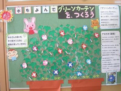 7月14日(水)、本のグリーンカーテンが成長し、朝顔の花がたくさん咲いていました。横には、朝顔の豆知識と図鑑などの参考図書を紹介する工夫がしてありました。図書館サポーターと図書担当の先生のアイディアいっぱいの掲示物で、本好きの子どもがどんどん増えているようです。