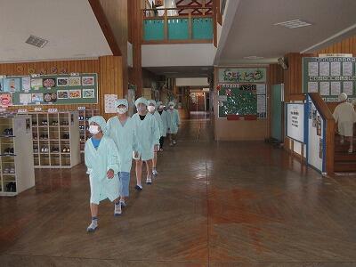 7月13日(火)、給食当番の様子です。一列になって無言で行動しています。給食室前で何学級か重なっても交錯することなく大変静かに待っています。「右一静歩」を徹底している成果でしょう。