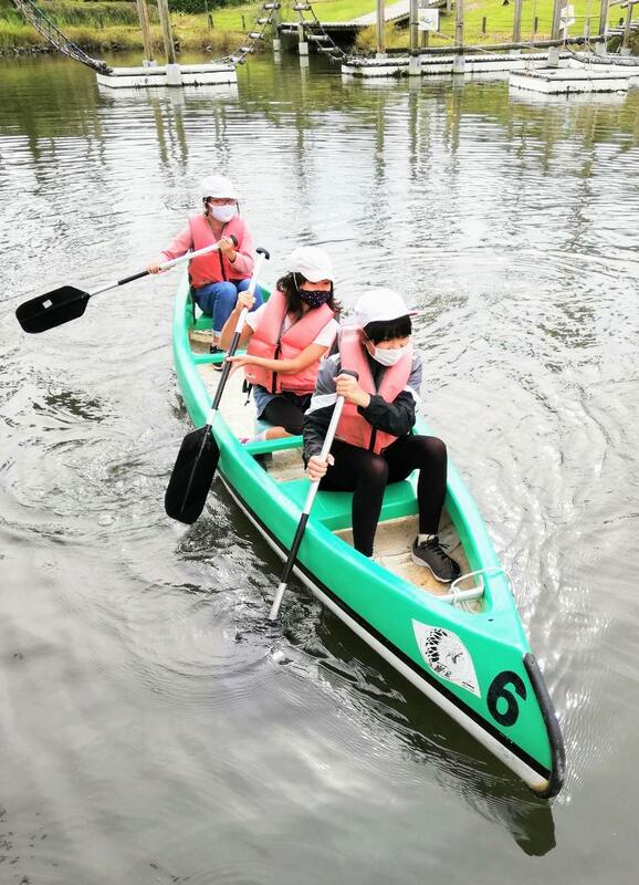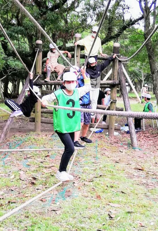 午後は、予定を変更してフィールドアスレチックをしました。カヌーや綱渡り、バランスなど体験しています。みんな楽しく活動しています。