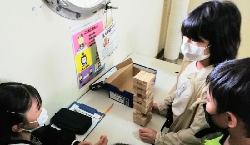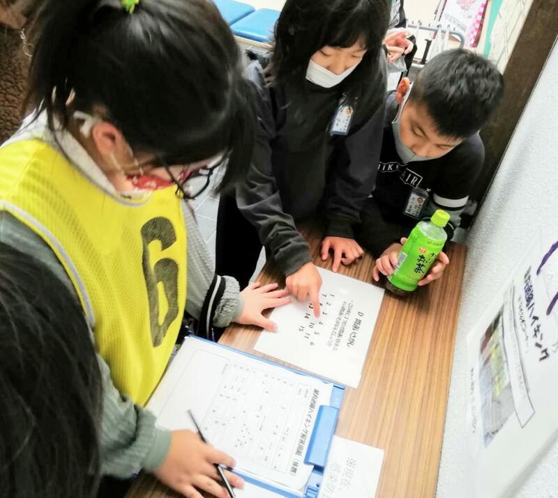 天候が心配なので、室内追跡ハイキングに変更になりました。活動班で問題をクリアしていきます。班のみんなで協力しながら問題を考えています。