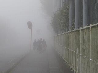 10月22日(金)は、霧に包まれた真っ白な朝でした。登校してくる子ども達も霧の中から現れてきます。安全のため学校周辺の横断歩道に立って登校の見守りをしました。運動場では霧の中でボランティアをする6年生の姿が見られました。