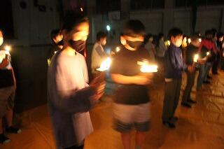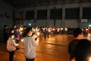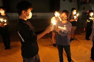 10月25日(月)は、先週紹介できなかった宿泊学習の様子を紹介します。1日目の最後のプログラム「キャンドルファイヤー」です。静・動・静の3部構成になっています。1部は聖火台に火を灯し、2部は友達と交流を深め、3部は全員がろうそくに火を灯しこれからの誓いを心に描きました。営火係のロウソクの火がみんなに広がって、おごそかな雰囲気でした。