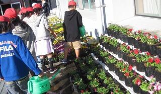 11月15日(月)、2年生と4年生が花の苗植えをしていました。春に咲くビオラやパンジー、ノースポールの花を学級園に植えました。また、卒業式で飾るために一人一鉢でビオラも植えていました。みんなていねいに優しく植えていました。