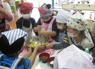 11月17日(水)、3年生が収穫したサツマイモでねったぼ作りをしました。先週は3組、今日は2組、19日に1組が行います。地域の方から作り方を教えていただいて、交代で芋を切ったり潰したり楽しそうに作っていました。