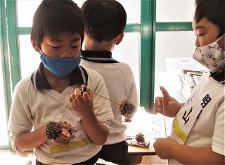 11月19日(金)、1年生が生活科の学習で秋のおもちゃづくりを行いました。まち探検等で集めてきた葉っぱや木の実を使って楽しく工作していました。まつぼっくりのやじろべえやけん玉、どんぐりこま、マラカス、オナモミの実を使ってさかなつりなど、アイディアいっぱいのいろいろなおもちゃを作り、友だちに見せて楽しく遊んでいました。