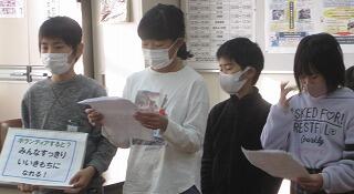 11月25日(木)、リモートで全校朝会を行いました。校長先生のお話や計画委員会からの呼びかけ、表彰がありました。計画委員会から、もっと素晴らしい明和小にするために、右一静歩などの決まりを守り、ボランティアをがんばろう!とカードや音楽を使って工夫した呼びかけがありました。
