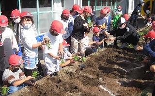 11月15日(月)、2年生と4年生が花の苗植えをしていました。春に咲くビオラやパンジー、ノースポールの花を学級園に植えました。また、卒業式で飾るために一人一鉢でビオラも植えていました。みんなていねいに優しく植えていました。