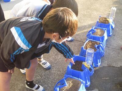 12月15日(水)、朝登校すると花のお世話をしている子をよく見ます。1年生はチューリップの球根を植えたので、毎朝芽がでていないか楽しみに水やりをしています。今朝は「○○さんの芽がでてます!」と教えてくれました。1ミリくらいの小さな芽を発見し、大喜びでした。