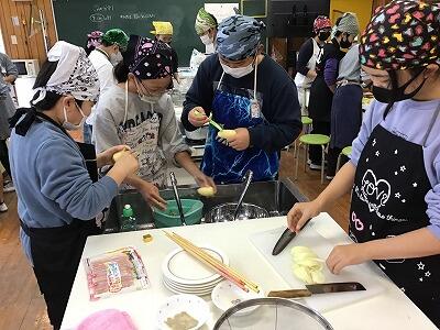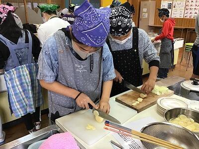 12月20日(月)、先週末に6年生が家庭科の調理実習を行いました。献立はジャーマンポテトでした。じゃがいもの皮をむいたり、材料を切ったり、炒めたりと友達と協力して作っていました。数年後には一人暮らしをする子もいるでしょう。冬休みに家で調理して、家族みんなで食事を楽しんでみてください。